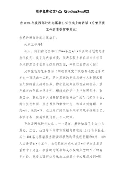 【七哥公文】2025年:在2025年度西部计划志愿者出征仪式上的讲话(分管团委工作的党委常委同志)+更多免费公文+VX:QiGeGongWen2024+更多免费公文+VX:QiGeGongWen2024