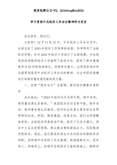 【七哥公文】2025年:学习贯彻中央经济工作会议精神研讨发言+更多免费公文+VX:QiGeGongWen2024+更多免费公文+VX:QiGeGongWen2024