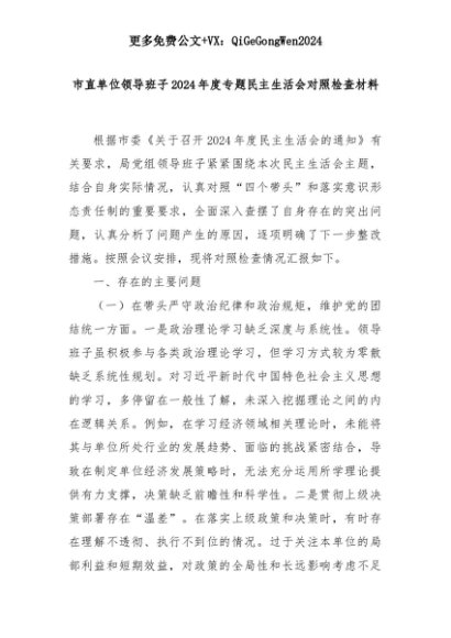 【七哥公文】2025年:市直单位领导班子2024年度专题民主生活会对照检查材料+更多免费公文+VX:QiGeGongWen2024+更多免费公文+VX:QiGeGongWen2024