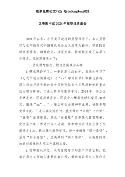 【七哥公文】2025年:区委副书记2024年述职述责报告+更多免费公文+VX:QiGeGongWen2024+更多免费公文+VX:QiGeGongWen2024
