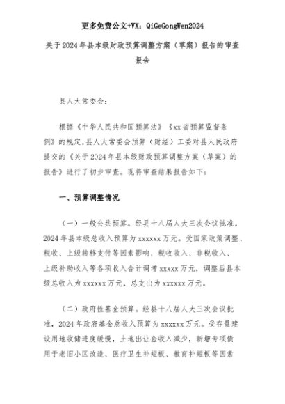 【七哥公文】2025年:关于2024年县本级财政预算调整方案(草案)报告的审查报告+更多免费公文+VX:QiGeGongWen2024+更多免费公文+VX:QiGeGongWen2024