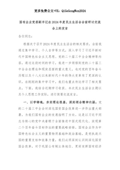 【七哥公文】2025年:国有企业党委副书记在2024年度民主生活会会前研讨交流会上的发言+更多免费公文+VX:QiGeGongWen2024+更多免费公文+VX:QiGeGongWen2024