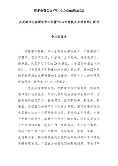 【七哥公文】2025年:县委副书记在理论中心组暨2024年度民主生活会学习研讨会上的发言+更多免费公文+VX:QiGeGongWen2024+更多免费公文+VX:QiGeGongWen2024