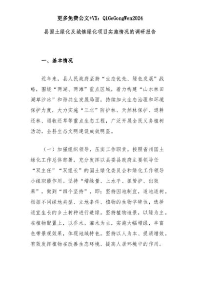 【七哥公文】2025年:县国土绿化及城镇绿化项目实施情况的调研报告+更多免费公文+VX:QiGeGongWen2024+更多免费公文+VX:QiGeGongWen2024