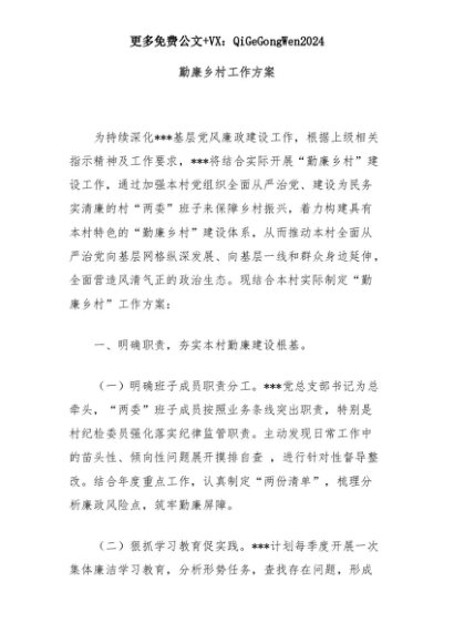 【七哥公文】2025年:勤廉乡村工作方案+更多免费公文+VX:QiGeGongWen2024+更多免费公文+VX:QiGeGongWen2024