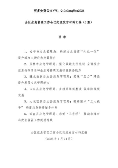 【七哥公文】2025年:(6篇)全区应急管理工作会议交流发言材料汇编+更多免费公文+VX:QiGeGongWen2024+更多免费公文+VX:QiGeGongWen2024