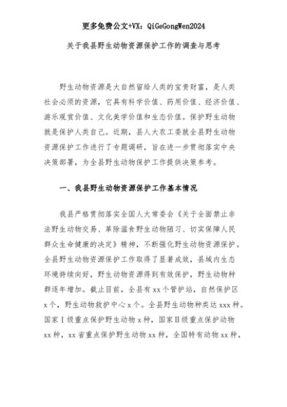 【七哥公文】2025年:关于我县野生动物资源保护工作的调查与思考+更多免费公文+VX:QiGeGongWen2024+更多免费公文+VX:QiGeGongWen2024