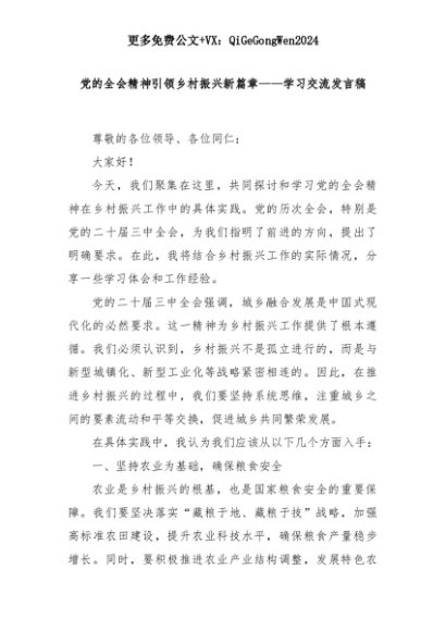 【七哥公文】2025年:党的全会精神引领乡村振兴新篇章——学习交流发言稿+更多免费公文+VX:QiGeGongWen2024+更多免费公文+VX:QiGeGongWen2024