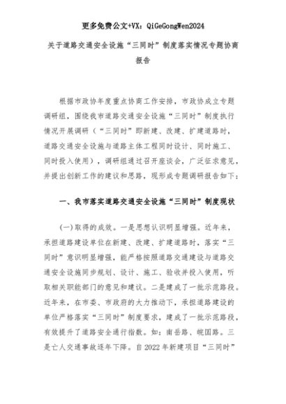 【七哥公文】2025年:关于道路交通安全设施“三同时”制度落实情况专题协商报告+更多免费公文+VX:QiGeGongWen2024+更多免费公文+VX:QiGeGongWen2024