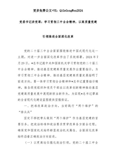 【七哥公文】2025年:党委书记讲党课:学习贯彻三中全会精神,以高质量党建引领推进全面深化改革+更多免费公文+VX:QiGeGongWen2024+更多免费公文+VX:QiGeGongWen2024