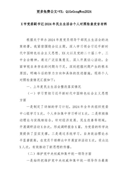 【七哥公文】2025年:X市党委副书记2024年民主生活会个人对照检查发言材料+更多免费公文+VX:QiGeGongWen2024+更多免费公文+VX:QiGeGongWen2024