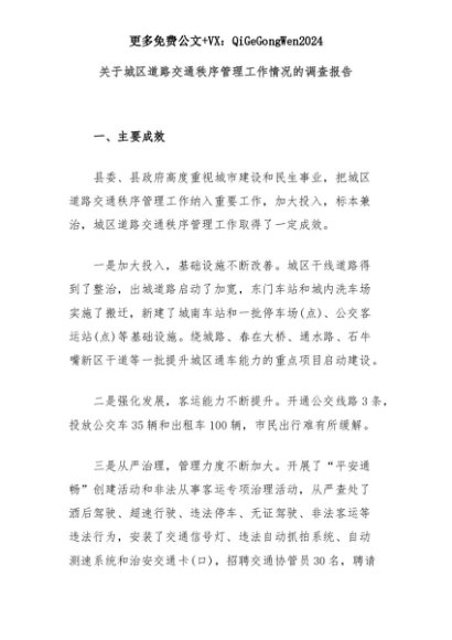 【七哥公文】2025年:关于城区道路交通秩序管理工作情况的调查报告+更多免费公文+VX:QiGeGongWen2024+更多免费公文+VX:QiGeGongWen2024