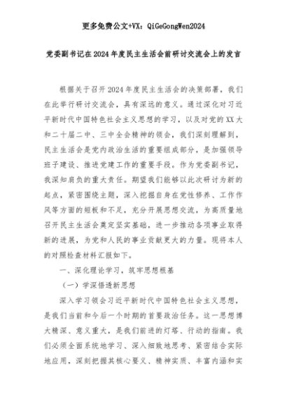 【七哥公文】2025年:党委副书记在2024年度民主生活会前研讨交流会上的发言+更多免费公文+VX:QiGeGongWen2024+更多免费公文+VX:QiGeGongWen2024