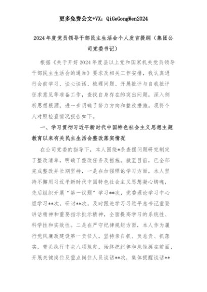 【七哥公文】2025年:2024年度党员领导干部民主生活会个人发言提纲(集团公司党委书记)+更多免费公文+VX:QiGeGongWen2024+更多免费公文+VX:QiGeGongWen2024