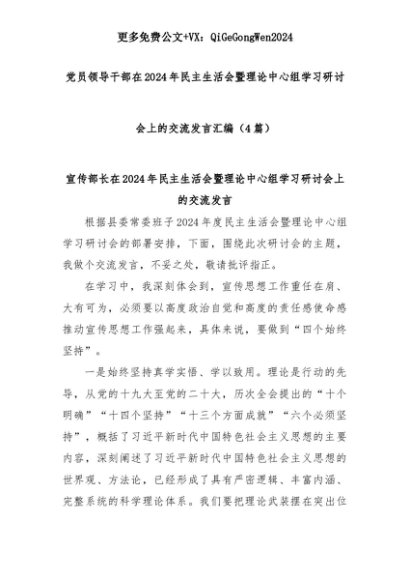 【七哥公文】2025年:(4篇)党员领导干部在2024年民主生活会暨理论中心组学习研讨会上的交流发言汇编+更多免费公文+VX:QiGeGongWen2024+更多免费公文+VX:QiGeGongWen2024