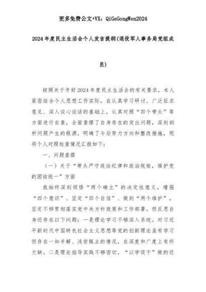 【七哥公文】2025年:2024年度民主生活会个人发言提纲(退役军人事务局党组成员)+更多免费公文+VX:QiGeGongWen2024+更多免费公文+VX:QiGeGongWen2024