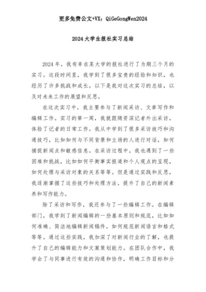 【七哥公文】2025年:2024大学生报社实习总结+更多免费公文+VX:QiGeGongWen2024+更多免费公文+VX:QiGeGongWen2024