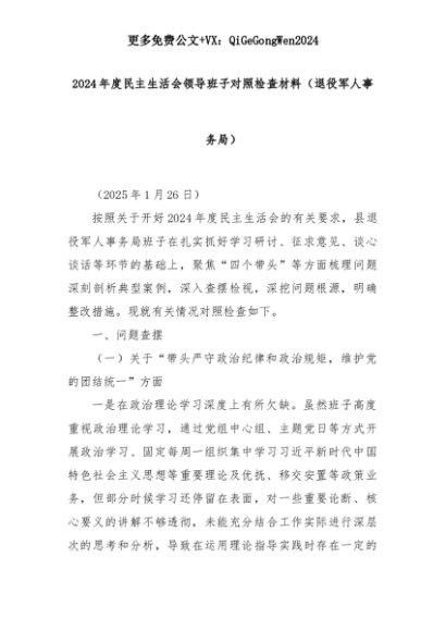【七哥公文】2025年:2024年度民主生活会领导班子对照检查材料(退役军人事务局)+更多免费公文+VX:QiGeGongWen2024+更多免费公文+VX:QiGeGongWen2024