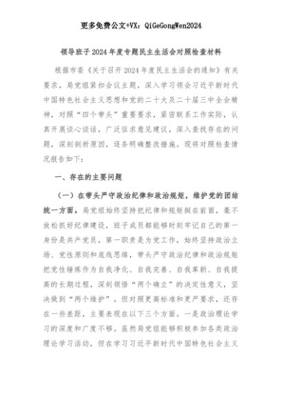 【七哥公文】2025年:领导班子2024年度专题民主生活会对照检查材料+更多免费公文+VX:QiGeGongWen2024+更多免费公文+VX:QiGeGongWen2024