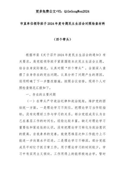 【七哥公文】2025年:市直单位领导班子2024年度专题民主生活会对照检查材料(四个带头)+更多免费公文+VX:QiGeGongWen2024+更多免费公文+VX:QiGeGongWen2024
