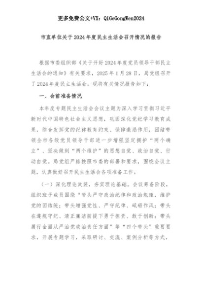 【七哥公文】2025年:市直单位关于2024年度民主生活会召开情况的报告+更多免费公文+VX:QiGeGongWen2024+更多免费公文+VX:QiGeGongWen2024