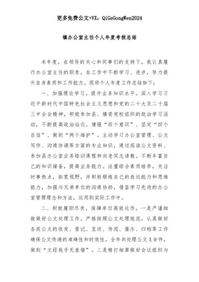 【七哥公文】2025年:镇办公室主任个人年度考核总结+更多免费公文+VX:QiGeGongWen2024+更多免费公文+VX:QiGeGongWen2024