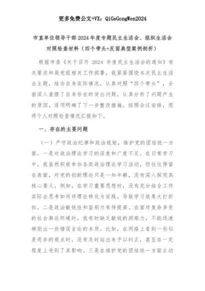 【七哥公文】2025年:市直单位领导干部2024年度专题民主生活会、组织生活会对照检查材料(四个带头+反面典型案例剖析)+更多免费公文+VX:QiGeGongWen2024+更多免费公文+VX:QiGeGongWen2024