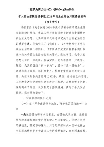 【七哥公文】2025年:市人民检察院党组书记2024年民主生活会对照检查材料(四个带头)+更多免费公文+VX:QiGeGongWen2024+更多免费公文+VX:QiGeGongWen2024