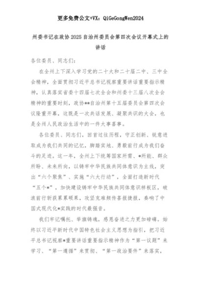 【七哥公文】2025年:州委书记在政协2025自治州委员会第四次会议开幕式上的讲话+更多免费公文+VX:QiGeGongWen2024+更多免费公文+VX:QiGeGongWen2024