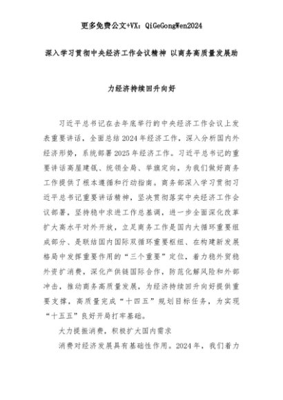 【七哥公文】2025年:深入学习贯彻中央经济工作会议精神 以商务高质量发展助力经济持续回升向好+更多免费公文+VX:QiGeGongWen2024+更多免费公文+VX:QiGeGongWen2024