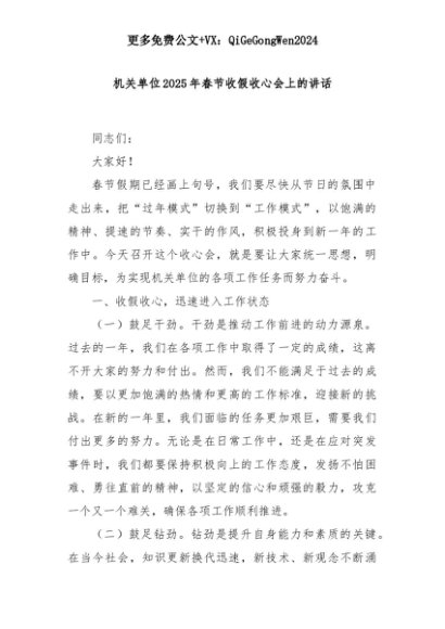 【七哥公文】2025年:机关单位2025年春节收假收心会上的讲话+更多免费公文+VX:QiGeGongWen2024+更多免费公文+VX:QiGeGongWen2024