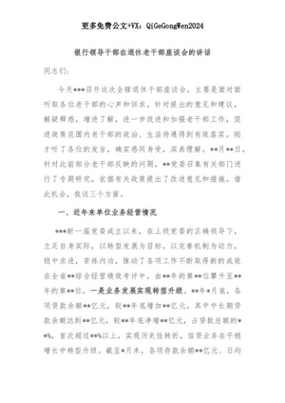 【七哥公文】2025年:银行领导干部在退休老干部座谈会的讲话+更多免费公文+VX:QiGeGongWen2024+更多免费公文+VX:QiGeGongWen2024