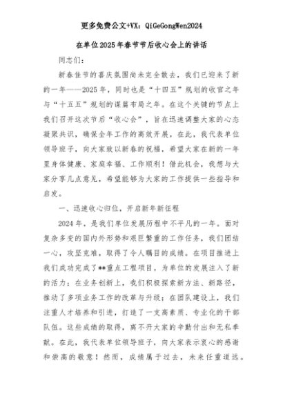 【七哥公文】2025年:在单位2025年春节节后收心会上的讲话+更多免费公文+VX:QiGeGongWen2024+更多免费公文+VX:QiGeGongWen2024