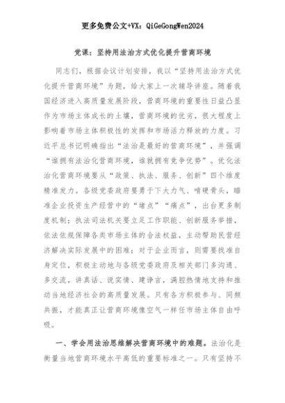 【七哥公文】2025年:党课:坚持用法治方式优化提升营商环境+更多免费公文+VX:QiGeGongWen2024+更多免费公文+VX:QiGeGongWen2024