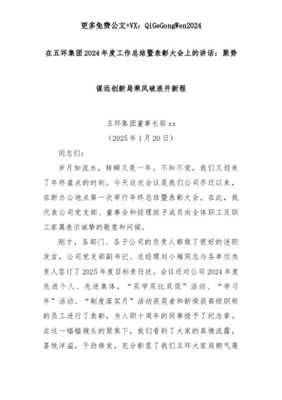 【七哥公文】2025年:在五环集团2024年度工作总结暨表彰大会上的讲话:聚势谋远创新局乘风破浪开新程+更多免费公文+VX:QiGeGongWen2024+更多免费公文+VX:QiGeGongWen2024