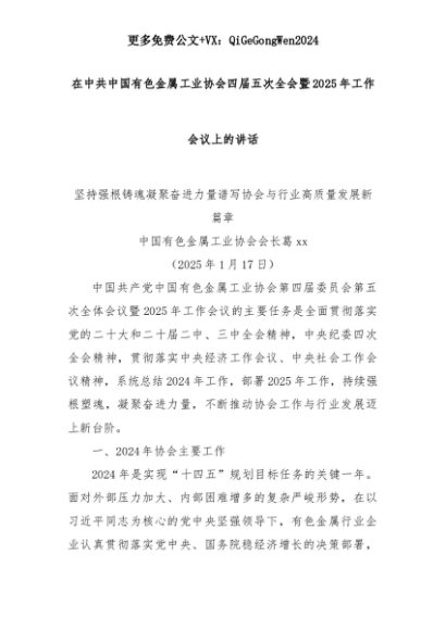 【七哥公文】2025年:在中共中国有色金属工业协会四届五次全会暨2025年工作会议上的讲话+更多免费公文+VX:QiGeGongWen2024+更多免费公文+VX:QiGeGongWen2024
