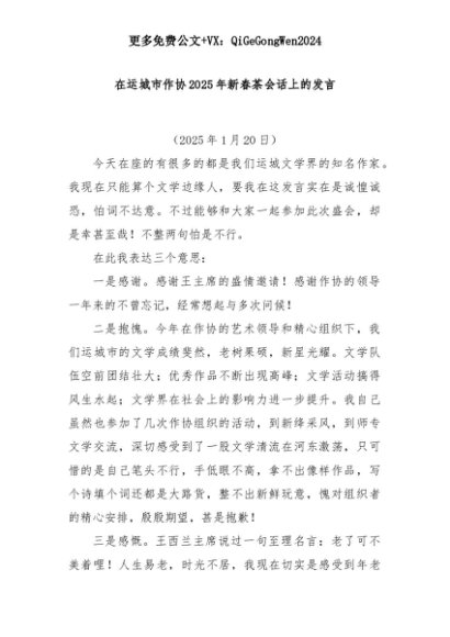 【七哥公文】2025年:在运城市作协2025年新春茶会话上的发言+更多免费公文+VX:QiGeGongWen2024+更多免费公文+VX:QiGeGongWen2024