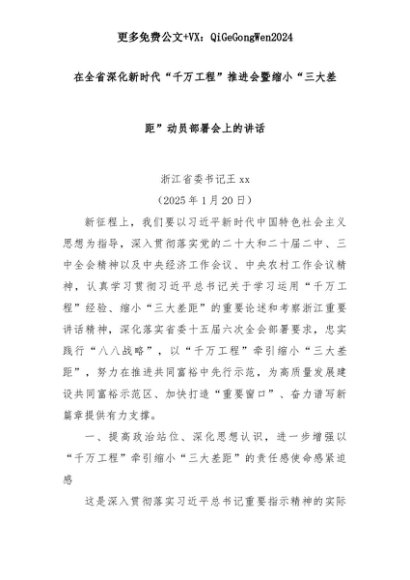 【七哥公文】2025年:在全省深化新时代“千万工程”推进会暨缩小“三大差距”动员部署会上的讲话+更多免费公文+VX:QiGeGongWen2024+更多免费公文+VX:QiGeGongWen2024