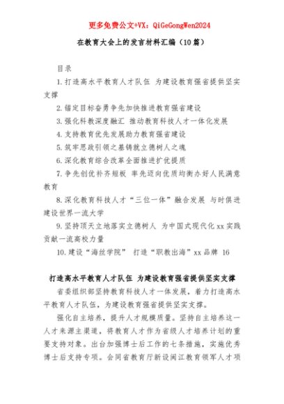 【七哥公文】2025年:(10篇)在教育大会上的发言材料汇编+更多免费公文+VX:QiGeGongWen2024+更多免费公文+VX:QiGeGongWen2024