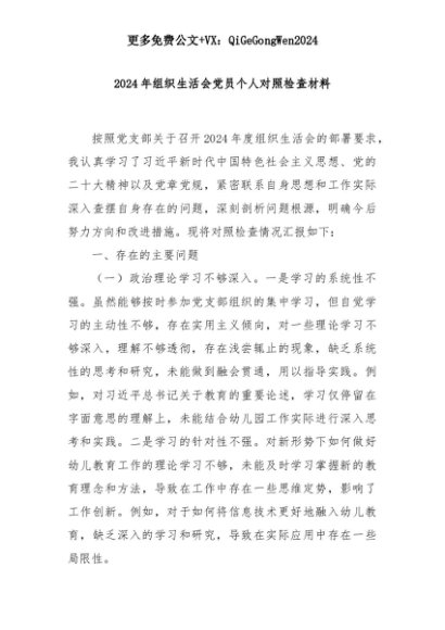 【七哥公文】2025年:2024年组织生活会党员个人对照检查材料+更多免费公文+VX:QiGeGongWen2024+更多免费公文+VX:QiGeGongWen2024