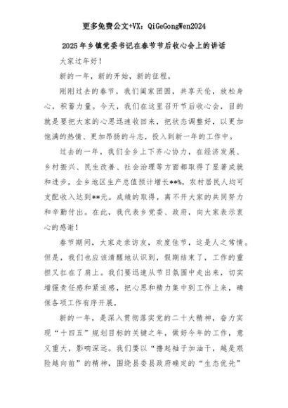 【七哥公文】2025年:2025年乡镇党委书记在春节节后收心会上的讲话+更多免费公文+VX:QiGeGongWen2024+更多免费公文+VX:QiGeGongWen2024