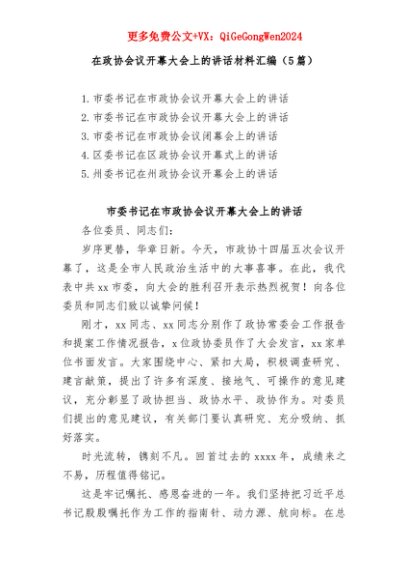【七哥公文】2025年:(5篇)在政协会议开幕大会上的讲话材料汇编+更多免费公文+VX:QiGeGongWen2024+更多免费公文+VX:QiGeGongWen2024
