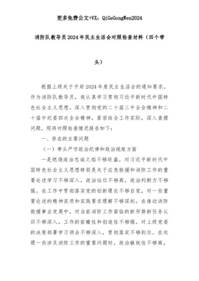 【七哥公文】2025年:消防队教导员2024年民主生活会对照检查材料(四个带头)+更多免费公文+VX:QiGeGongWen2024+更多免费公文+VX:QiGeGongWen2024