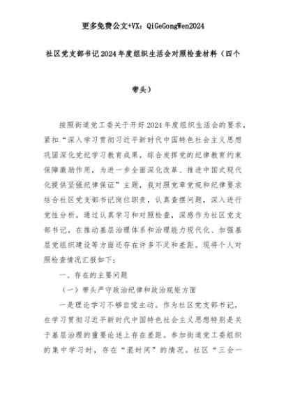 【七哥公文】2025年:社区党支部书记2024年度组织生活会对照检查材料(四个带头)+更多免费公文+VX:QiGeGongWen2024+更多免费公文+VX:QiGeGongWen2024
