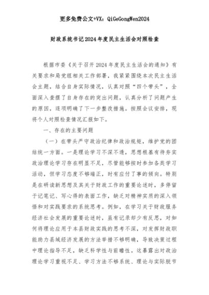 【七哥公文】2025年:财政系统书记2024年度民主生活会对照检查+更多免费公文+VX:QiGeGongWen2024+更多免费公文+VX:QiGeGongWen2024