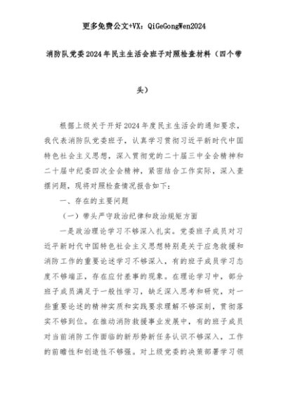 【七哥公文】2025年:消防队党委2024年民主生活会班子对照检查材料(四个带头)+更多免费公文+VX:QiGeGongWen2024+更多免费公文+VX:QiGeGongWen2024