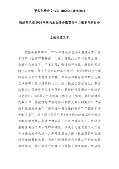【七哥公文】2025年:统战部长在2024年度民主生活会暨理论中心组学习研讨会上的交流发言+更多免费公文+VX:QiGeGongWen2024+更多免费公文+VX:QiGeGongWen2024