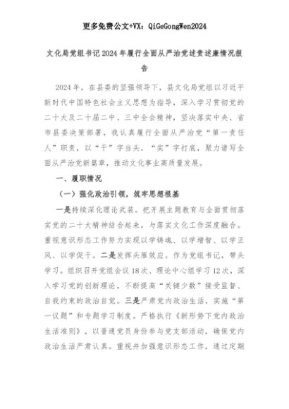 【七哥公文】2025年:文化局党组书记2024年履行全面从严治党述责述廉情况报告+更多免费公文+VX:QiGeGongWen2024+更多免费公文+VX:QiGeGongWen2024