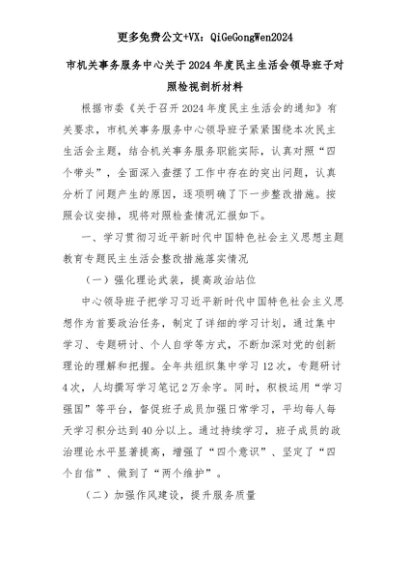 【七哥公文】2025年:市机关事务服务中心关于2024年度民主生活会领导班子对照检视剖析材料+更多免费公文+VX:QiGeGongWen2024+更多免费公文+VX:QiGeGongWen2024