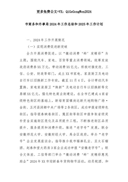 【七哥公文】2025年:市商务和外事局2024年工作总结和2025年工作计划+更多免费公文+VX:QiGeGongWen2024+更多免费公文+VX:QiGeGongWen2024